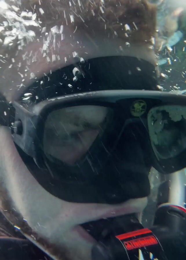 A first-person perspective video shows a person wearing a black diving mask and a snorkel going underwater