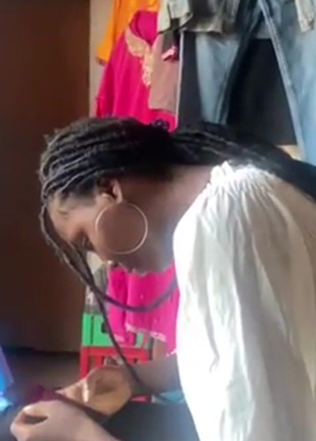 A woman with black dreadlocks and large hoop earrings is sitting on a blue stool, focused on working with fabric. She is wearing a white blouse. Behind her, clothes hang on a rack, including a yellow top, a pink top, and a denim jacket. The room appears to be a workspace or small shop.