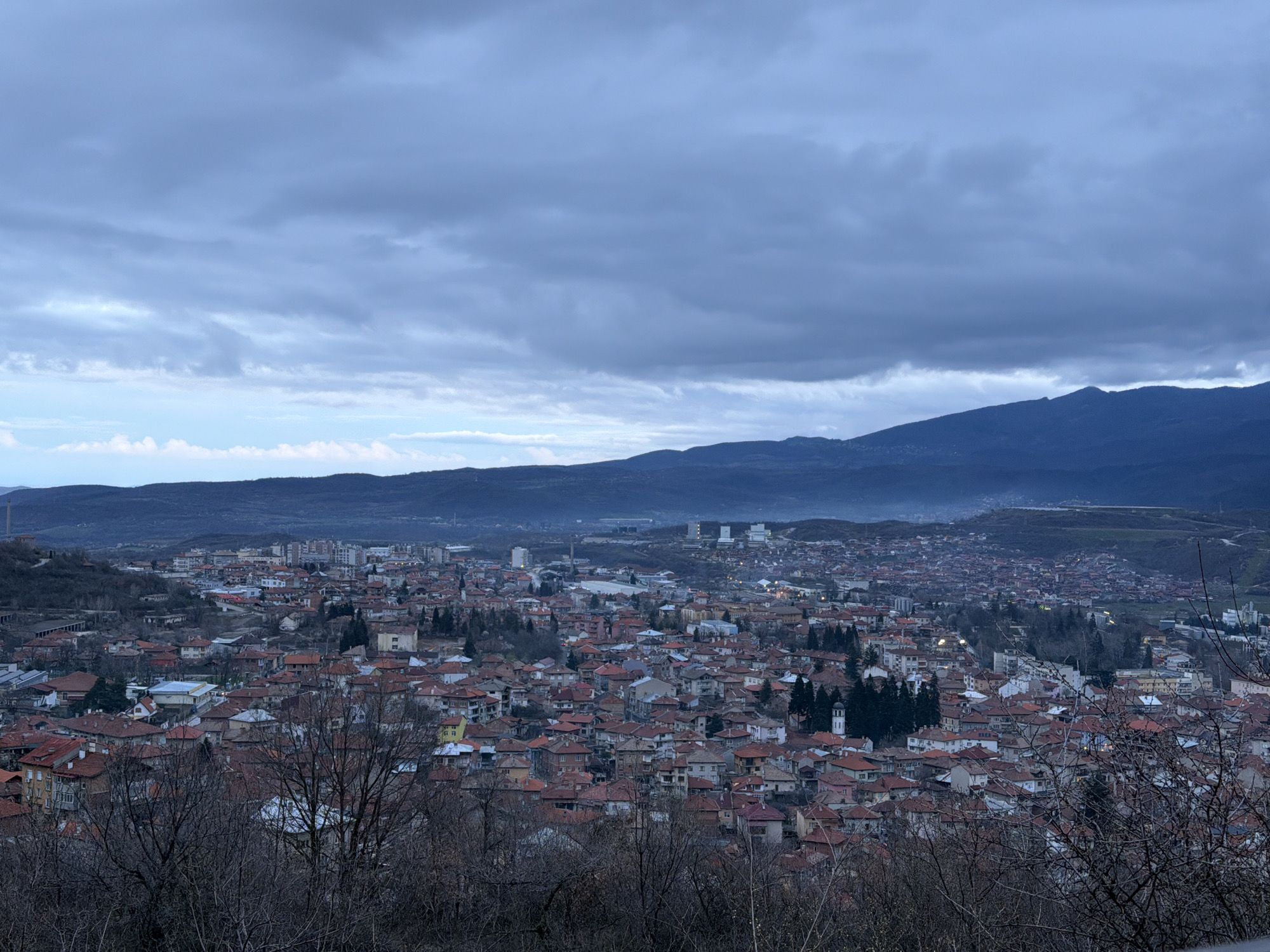 n overview of a densely populated urban area, most likely a city, under a cloudy, overcast sky. The architecture appears to be varied, with a mix of low-rise residential buildings with red-tiled roofs and taller structures in the distance, possibly commercial or apartment buildings. The layout of the city is characterized by tightly packed buildings, with few visible open spaces. In the foreground, there are bare trees and vegetation, suggesting it might be late autumn or winter. Beyond the urban area, the landscape rises into hills or mountains, adding depth to the scene. The location is assumed to be Sveti Konstantin, Bulgaria, based on the prompt, which suggests that is the location of this image. There are no people visible in the frame.