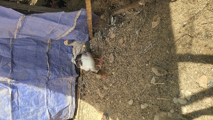 In Gwammaja, Nigeria, an outdoor scene is depicted under bright sunlight, casting distinct shadows on light brown, sandy-gravelly ground. A white domestic goose with brown markings on its back and head is centrally positioned, lowering its orange beak to the ground, appearing to forage. Its webbed feet are pinkish-red. Behind it, partially obscured, a lighter-colored goose with an orange beak rests near a crumpled, dirty blue tarp that forms a vertical background element. A possible white egg-like object is visible near the second goose. To the far right, a black chicken with a red comb is partially visible behind the blue tarp and a horizontal wooden plank. A dark mesh structure is present below the wooden plank.