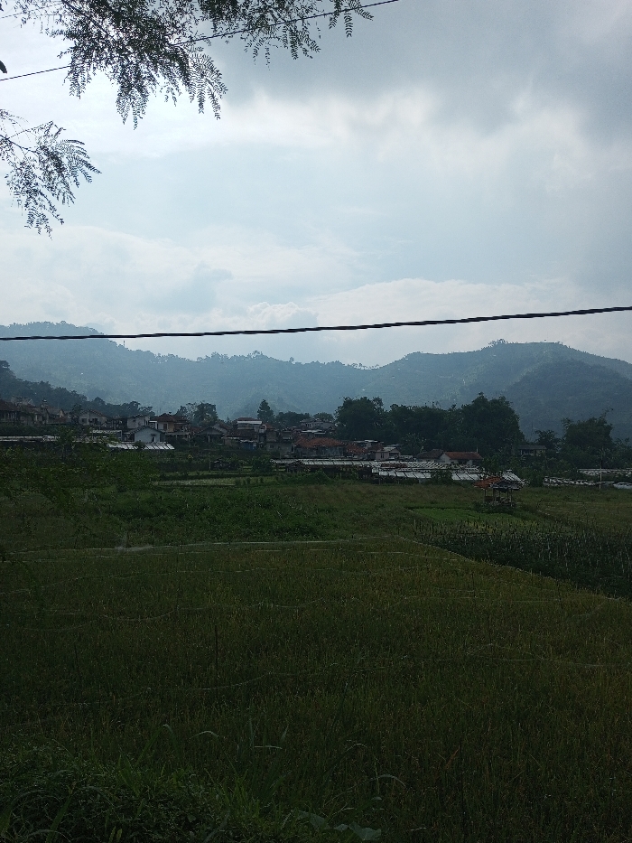 The scene depicts a panoramic view of a rural landscape within Sandamal Eliya, Sri Lanka. The foreground is filled with dense, dark green vegetation, consistent with agricultural fields, exhibiting faint horizontal line patterns. In the midground, a village settlement is visible, comprising multiple structures with varied roof colors, including red-brown and lighter shades, situated amidst cultivated green areas. Several structures with light-colored roofs, possibly greenhouses or agricultural shelters, are interspersed within these areas. A dark, thin wire or cable traverses horizontally across the upper midground. The background features successive ranges of green, tree-covered mountains, receding into a hazy distance under an overcast sky with visible cloud formations. Dark tree branches with foliage are present at the top edge of the frame. No individuals, explicit actions, or interactions are discernible within the image.