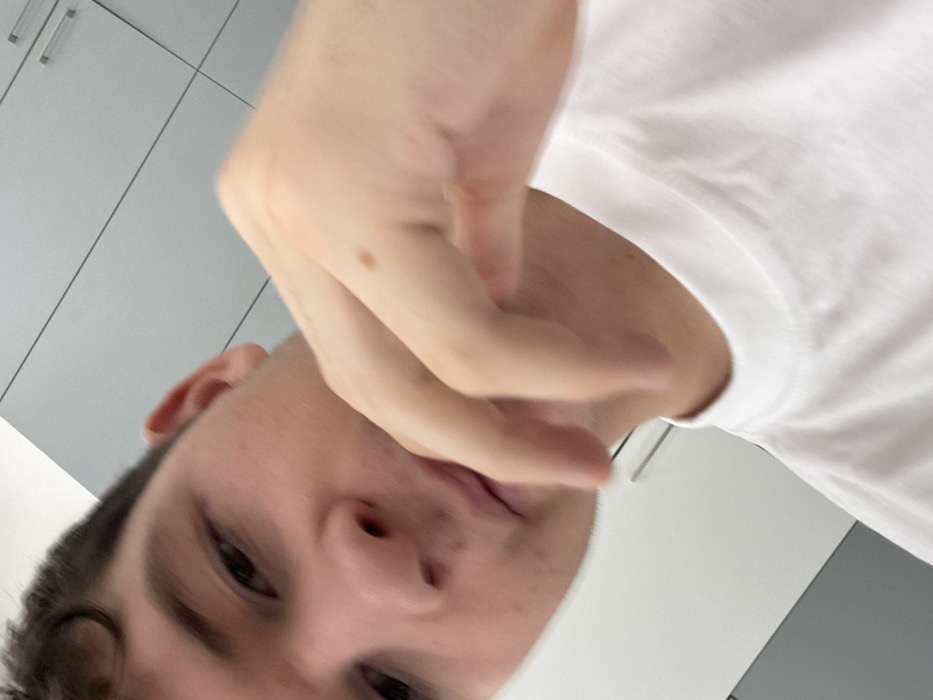 A person's face is close to the camera, turned slightly. One hand is raised and placed near the mouth. The individual has dark hair and appears to be wearing a white shirt. The background is a blurry mix of white and gray surfaces. The angle is unusual, giving a somewhat distorted view. The lighting is bright and even.