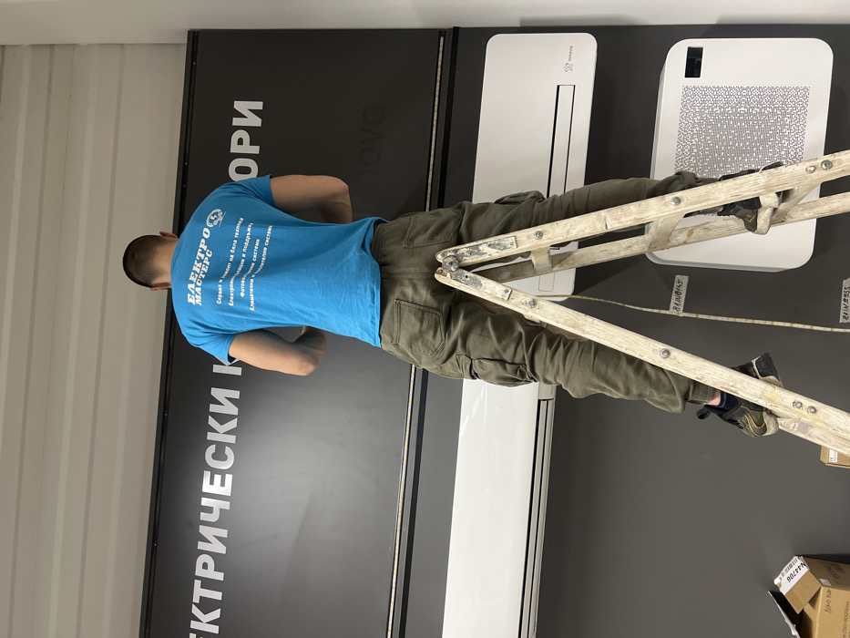 An individual, viewed from behind, stands on a light-colored wooden A-frame ladder within an indoor commercial establishment in Haskovo, Bulgaria. The subject is a male, wearing a bright blue short-sleeved t-shirt with "ЕЛЕКТРО МАЙСТЕРС" (Electro Masters) and a list of services in white Cyrillic text on the back, including "Service and repair of white goods," "Electrical installations and maintenance," "Photovoltaic systems," and "Air conditioning and ventilation systems." He is also dressed in olive green cargo pants and dark sneakers. The individual is positioned facing a dark gray wall, which serves as a display surface. Above his head, a large black sign features white Cyrillic text, partially visible as "Електрически Катори" (Electric Heaters/Categories). A thin horizontal strip of LED lighting is affixed directly below this sign. Mounted on the dark gray wall below the sign are two white indoor air conditioning units. The upper unit is horizontally oriented, while the lower unit, positioned to the right, exhibits a distinct patterned grille and the "Innovia" brand logo. A white cable or LED strip marked with alphanumeric codes (e.g., "81WN45") is draped over the ladder. Cardboard boxes are visible on the floor in the lower-left quadrant of the scene. The individual's stance suggests active engagement in an installation, maintenance, or inspection task related to the sign or the displayed equipment.