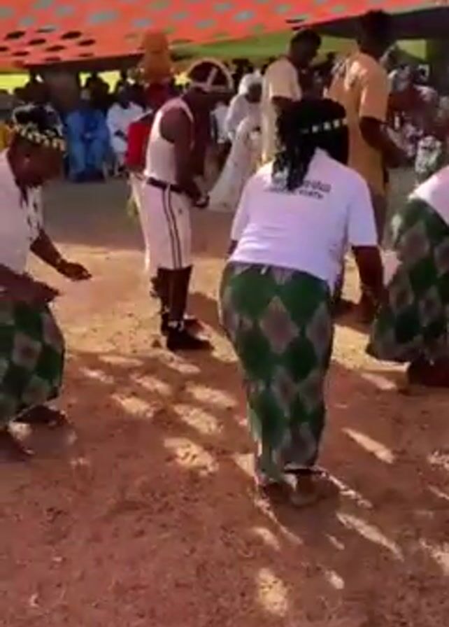 A group of people dance under a tent-like structure with a polka-dot pattern in an outdoor setting. Some individuals, including those wearing white t-shirts and green patterned skirts, move in a circle. Several men are dressed in white and gold athletic attire, and one plays a small drum. The crowd is gathered on a dirt surface. The people interact through dancing and music.
