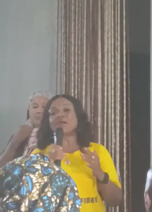 A woman in a yellow FIBERS t-shirt is speaking into a microphone, gesturing with her hands. She has shoulder-length dark hair. Another woman with a white headscarf stands behind her. A person wearing a blue and black patterned shirt is in the foreground to the left, and another person is partially visible on the right side. The background consists of a grey wall and curtains with vertical stripes.