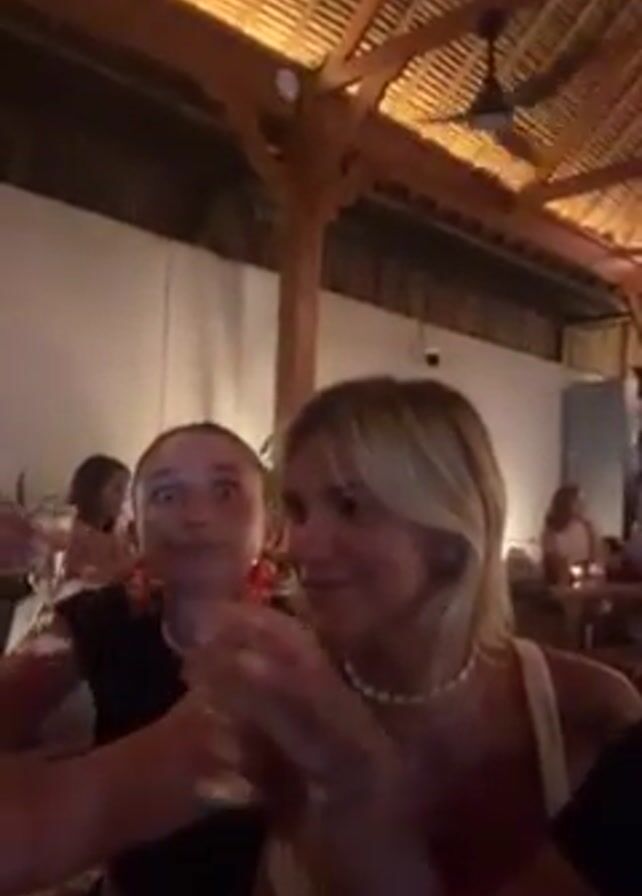 Two women hold up stemmed glasses in a toast at an indoor venue with a straw ceiling, exposed wood beams, and a ceiling fan. There's a disco ball hanging from the ceiling. Other people are seated in the background. The woman in the foreground has blonde hair and is wearing a white tank top. The woman to her left has her hair pulled back and is wearing a black top and a lei around her neck.