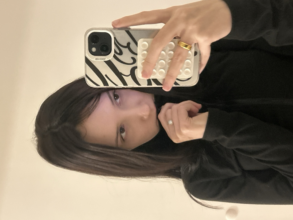 A young woman with long, dark hair wears a black turtleneck sweater while taking a selfie. Her phone has a black and white zebra-striped case with a white, dimpled accessory. She has a gold ring on one hand holding the phone and a ring with a prominent stone on the other hand that is touching her neck. The background appears to be a plain, light-colored wall. The photo is rotated, making the image appear sideways.