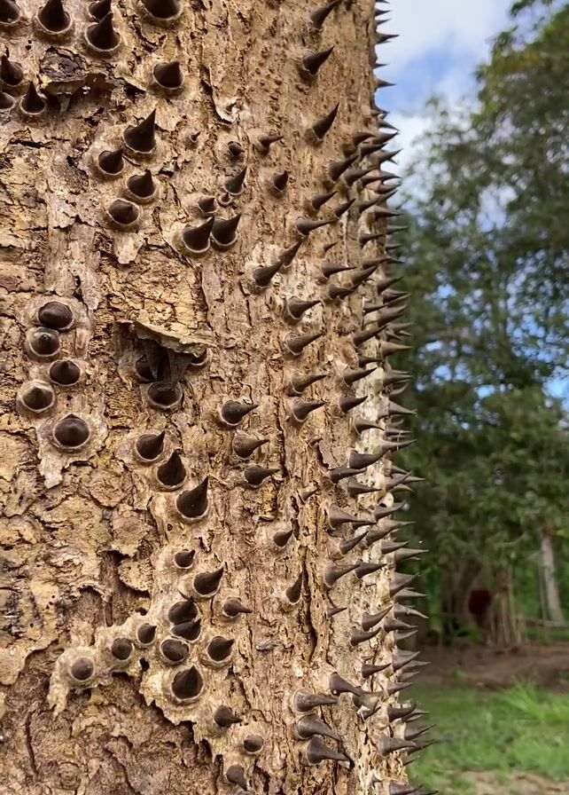 The camera pans slowly upwards, revealing the trunk of a tree densely covered in sharp, dark thorns
