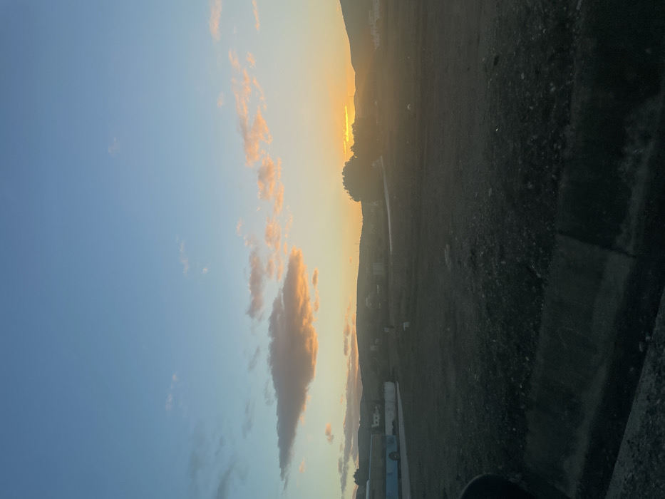 A tranquil scene unfolds with a vibrant sunset casting a warm glow. Wispy clouds dance in the sky, tinged with soft oranges and pinks. Below, the landscape transitions to a dark, earthy tone with visible terrain variations. The horizon is subtly interrupted by a gentle rise, suggesting distant hills or mountains silhouetted against the fading light. Along the bottom of the frame is a glimpse of what might be vehicles or infrastructure, adding a hint of human presence to the otherwise natural vista.