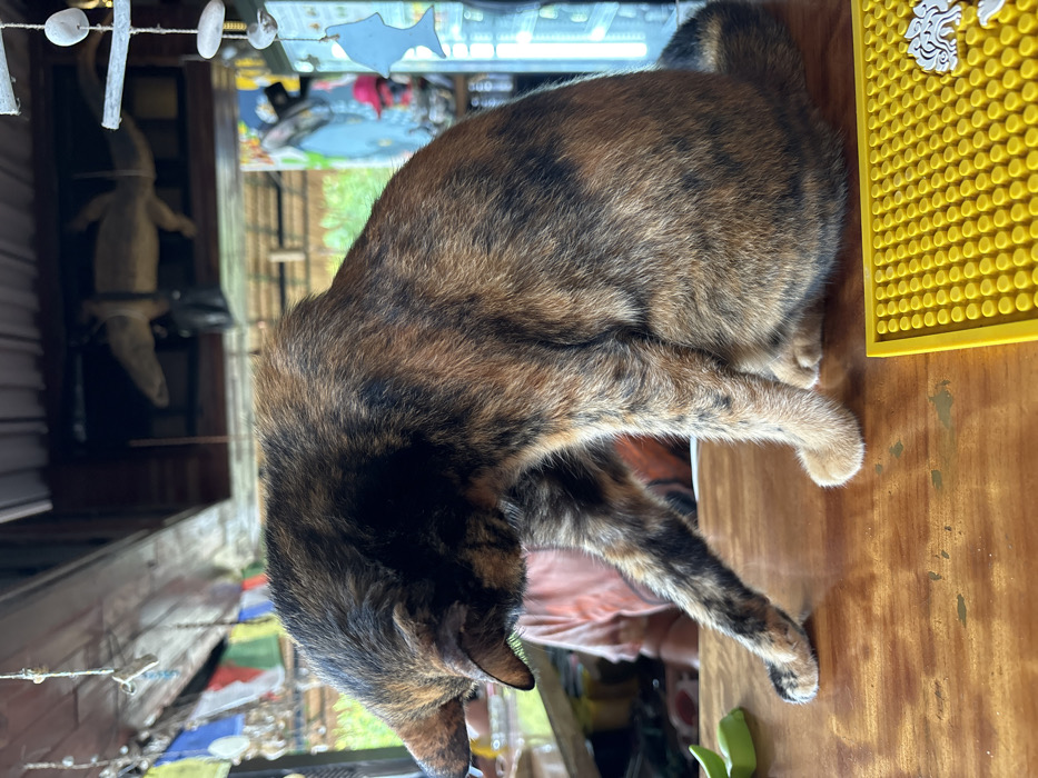 - "A tortoiseshell cat with black, brown, and orange fur sits on a wooden bar top within an open-air establishment in Ko Pha-ngan, Thailand" by FM-i1VQA3, licensed under CC BY 4.0