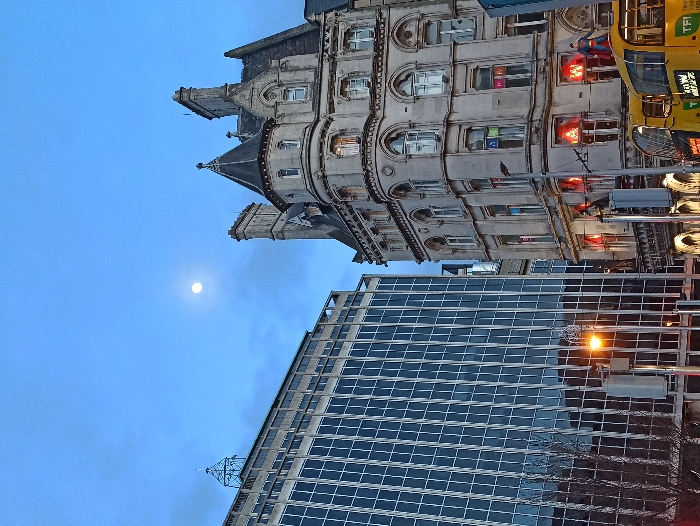 An urban twilight scene in Dublin, Ireland, depicting a blend of modern and historic architecture near College Green and Dame Street. On the left stands Liberty Hall, a tall, multi-story building characterized by a grid-patterned glass facade reflecting the dark blue sky. To the right is the ornate, stone-built former Bank of Ireland building, featuring a prominent corner turret with a conical roof, arched windows, and classical detailing. A full or near-full moon is visible in the upper center of the sky. Streetlights are illuminated, including a yellow-glowing fixture in the lower-left foreground. On a lower-story ledge of the historic building, a large, life-sized figure resembling Superman is positioned. The yellow upper deck of a Dublin tour bus, marked with "TFI" branding, is partially visible in the lower right foreground. Bare tree branches are present in the lower-left, reflected in the glass of Liberty Hall. Traffic light poles and other utility infrastructure are visible in the mid-ground.