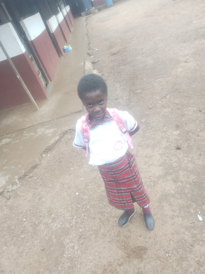 The image depicts a young girl standing on an unpaved dirt and gravel surface in Ukwu-Abwa, Nigeria