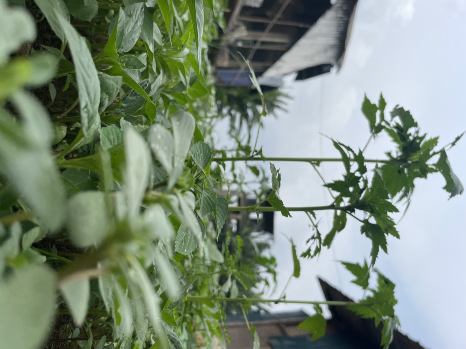 The scene depicts an outdoor vegetated area in Ikorodu, Nigeria, under an overcast sky. The immediate foreground features a dense, out-of-focus expanse of low-growing green leafy plants, with several visible water droplets on their surfaces. Taller, slender-stemmed green plants with deeply lobed or serrated leaves rise vertically through the midground, in focus. In the blurred background, a weathered structure with a corrugated metal roof and visible wooden supports is present on the left. A second, partially obscured structure with a lighter-toned wall is situated on the right. No human figures or specific actions are depicted.