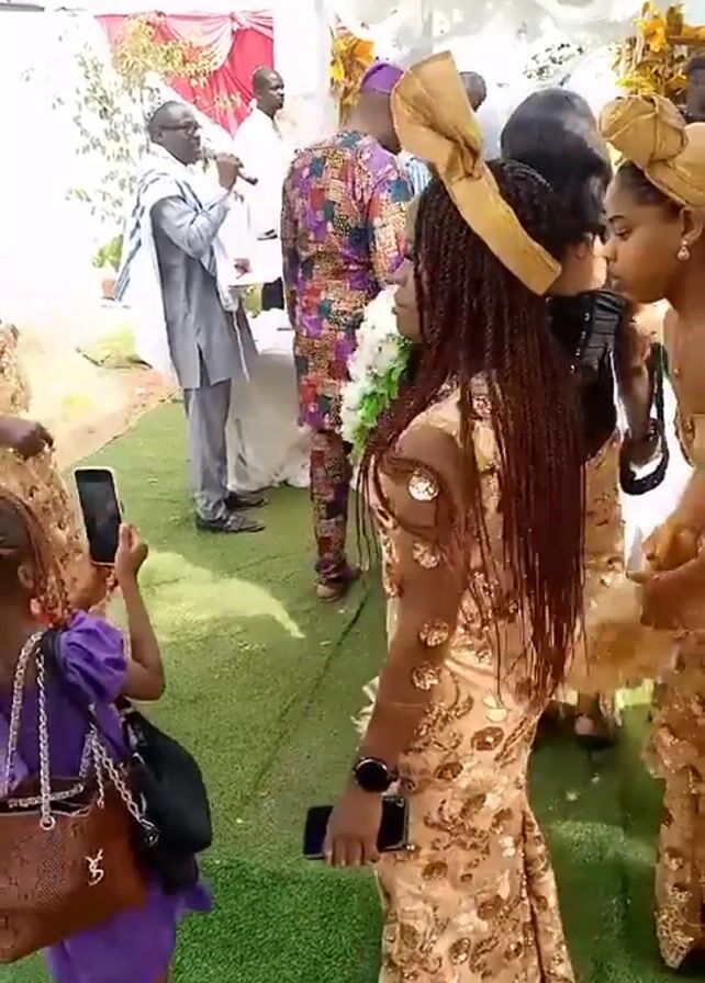 gathering of people, seemingly at an outdoor event, possibly a wedding. A man in a suit and glasses is speaking into a microphone near a table. Several women are dressed in matching gold and white outfits, wearing head wraps. A child in a purple dress is taking photos with a smartphone. The ground is covered in artificial green turf. In the background, there is a white tent or canopy and a decorated area with red and gold fabric. The overall atmosphere suggests a celebration or special occasion.
