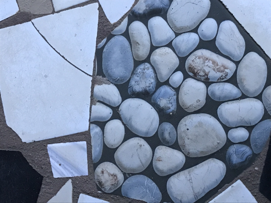 The image displays a close-up, downward-angled view of a patterned surface, possibly flooring or a pathway, located in Uyo, Nigeria. The surface is composed of a mosaic of irregularly shaped tiles and grout. The upper section features a fragmented design consisting of several off-white and light gray ceramic tile shards, some exhibiting subtle veining. A prominent, large off-white shard in the upper right quadrant displays a distinct, curved fracture line. These shards are set within a brown-gray grout. Below this mosaic, a large, dark gray, irregularly shaped tile is embedded, featuring a printed design of numerous rounded, smooth pebbles. These simulated pebbles vary in size and color, ranging from off-white and light gray to various shades of blue-gray. Some pebbles show faint striations or mottled brown and rust-colored inclusions. The pebble-patterned tile is also bordered by the same brown-gray grout material. No individuals, objects beyond the tiling materials, or actions are present in the scene.