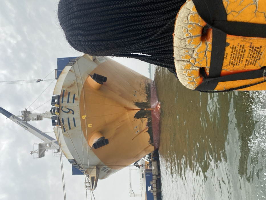 The image depicts a maritime scene in Alaiyabiagba, Nigeria, from a low perspective on a body of dark, choppy water under an overcast sky. In the foreground, the back of a person's head with black braided hair is visible on the right. An orange work vest, appearing weathered and cracked, is worn on their right shoulder/upper back, displaying partial legible text that includes "UNICELLULAR CLOSED CELL PLASTIC FOAM BUOYANT FORCE OF 17-1/2 LBS APPROVED FOR USE ON MERCHANT VESSELS AS A WORK VEST" and "THIS VEST IS FILLED WITH UNICELLULAR CLOSED CELL PLASTIC FOAM WHICH WILL NOT BE HARMED BY REPEATED NETTING." Dominating the midground and background is the bow of a large cargo or container ship, painted primarily yellow/orange with a white upper section and a red waterline. The hull exhibits significant paint degradation, scuff marks, and black discoloration, particularly around the bow. The number "9" is prominently displayed on the bow in dark characters, flanked by horizontal lines, and the partial text "EN LEONE" is visible below it. Two black thruster ports are visible on the ship's bow. A white Liebherr crane is mounted on the vessel's deck, and blue containers are visible on board, indicating ongoing cargo operations. Mooring lines extend from the ship towards a grey dock structure on the far left, alongside which another smaller white vessel, identified as "GREAT AMERICANA," is moored near additional blue containers.