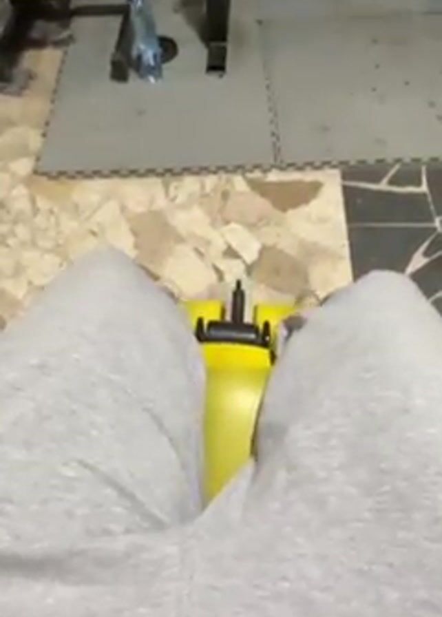 person sitting in a leg press machine at what appears to be a home gym. The individual is wearing gray sweatpants and tan-colored shoes. The leg press machine has yellow foam pads. There is a metal weight rack visible in the background. The floor has both gray and patterned tiles.
