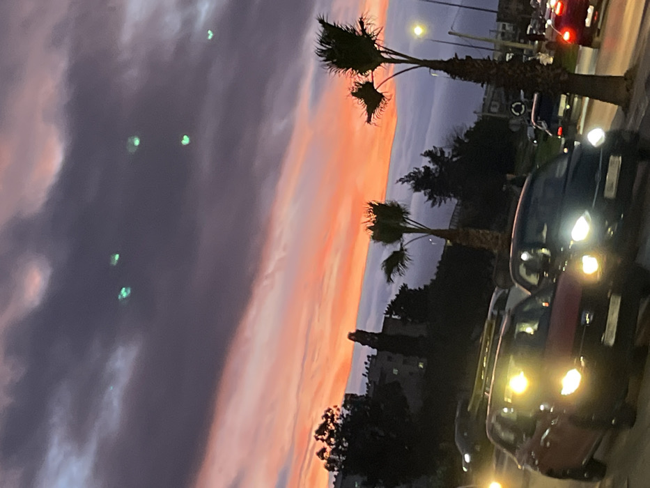 A colorful sunset sky with streaks of pink and purple contrasts with dark clouds. In the foreground, palm trees and other greenery line a street with parked cars. Car headlights illuminate the scene. Several green lights are visible in the sky.