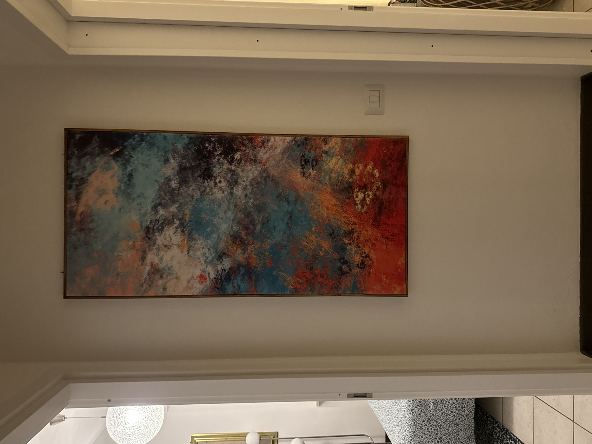 horizontally-oriented abstract painting with a bronze-colored frame mounted on a white wall above a doorway. The painting features a blend of colors including shades of blue, black, white, and orange. Above the painting is a light switch with three buttons. The doorway reveals a glimpse into another room with a patterned armchair, a spherical chandelier, a metal clothing rack with white spheres, and white tile flooring. The location is not discernible from the image and cannot be narrowed down to Perugia, Italy, or any specific geographic location.