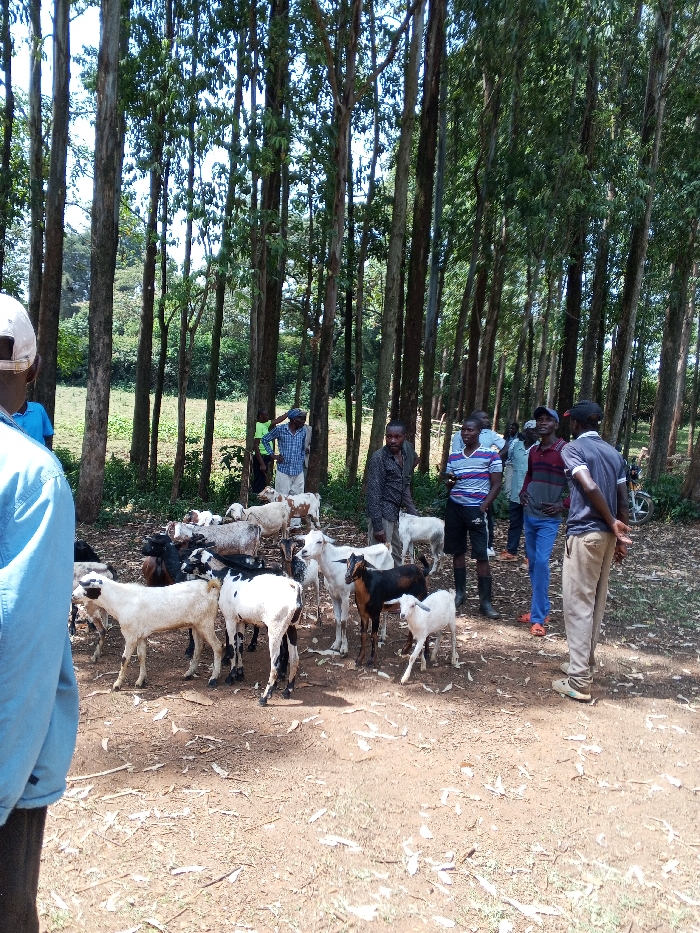 The scene depicts a gathering of people and goats within a dense stand of tall, slender trees, typical of a plantation, in Keyian ward, Kenya