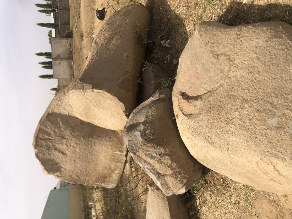 The image displays an outdoor scene in Dabawa, Nigeria, featuring multiple large, light-colored rock formations on dry, sparse ground under a bright, hazy sky. In the foreground, three primary rocks are visible: a rounded, erosion-marked rock in the lower center, an angular, fractured rock immediately behind it, and a larger, irregularly shaped rock on the left. In the midground, a substantial, elongated rock with a rounded end extends towards the right, partially obscuring smaller detritus and dry vegetation. A black, crumpled plastic bag rests on the ground near the far end of this elongated rock. The ground consists of parched, yellowish-brown grass and exposed soil, with some minimal green plant growth concentrated around the rock bases. In the background, a light-colored building with blue and yellow sections is visible on the far left, followed by a beige wall with rectangular patterns. Behind this wall, a line of approximately six to seven tall, slender, conical evergreen trees stands against the clear sky. No individuals or dynamic actions are present.