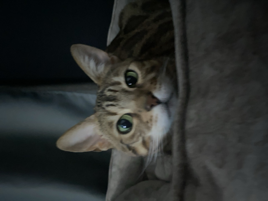 A Bengal cat peers inquisitively at the camera, head tilted sideways. The feline's striking green eyes and spotted coat are clearly visible. The cat appears to be nestled within a soft, cushioned space, with a dark, possibly fabric-covered area in the background. A post or fabric edge frames part of the cat's face, adding a sense of depth. The cat's white whiskers are prominent against its patterned fur.