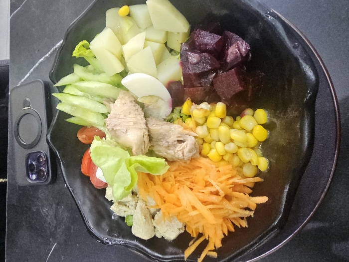 A black bowl brimming with a colorful salad rests on a dark surface alongside a smartphone. The salad includes chunks of potato, sliced cucumbers, diced beets, corn kernels, shredded carrots, pieces of tuna, halved hard-boiled egg, lettuce, and sliced tomatoes. The ingredients are arranged in distinct sections, showcasing a visually appealing composition. The bowl has a glossy finish.