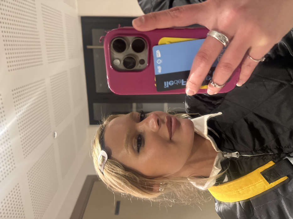 A selfie shows a blonde woman in a black jacket with yellow accents