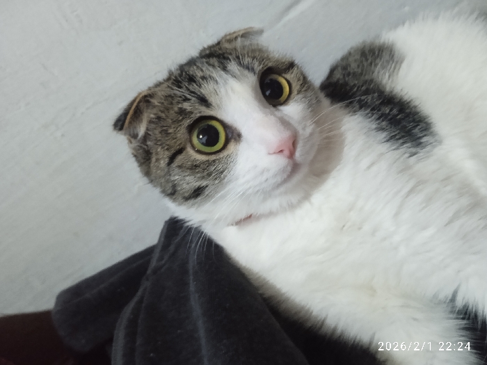 A white and gray tabby Scottish Fold cat stares wide-eyed at the camera with bright yellow-green eyes. The cat is lying on something dark, possibly clothing. The background is a plain white wall. The date and time, "2026/2/1 22:24," are faintly visible in the bottom right corner.