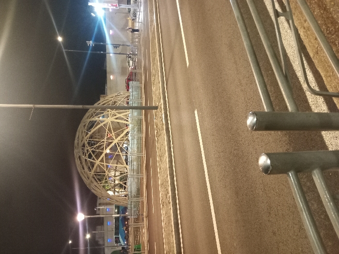 A street view at night shows a geodesic dome illuminated by streetlights