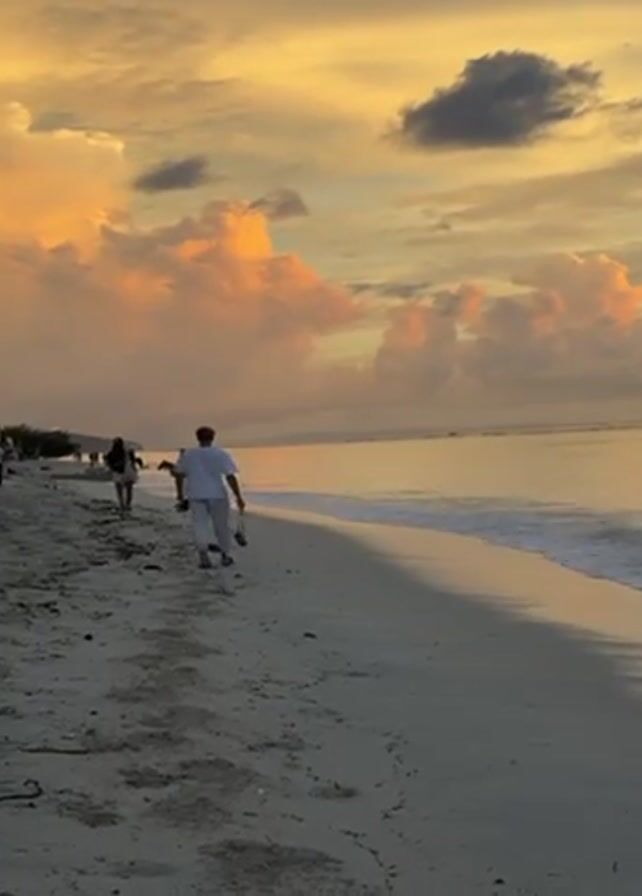 wide shot of a beach at sunset. The sky is a mix of yellow and orange hues with clouds. The beach is wide with light-colored sand. People are walking along the beach, including one person walking away from the camera, carrying shoes. There is also a horse with a rider visible further down the beach. The ocean is calm with small waves reaching the shore.