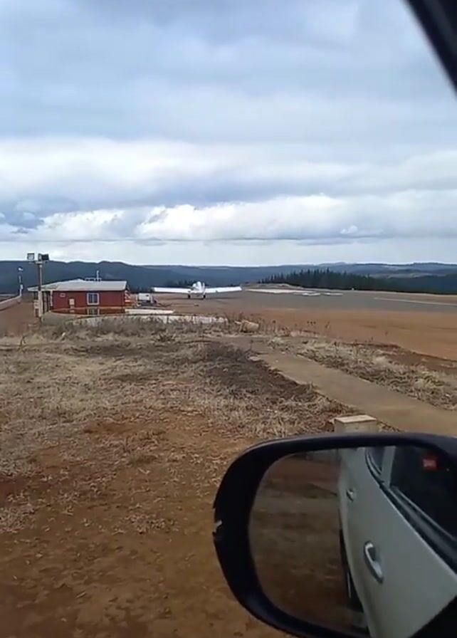 n airport from the perspective of the back seat of a car. The car is parked on a dirt road near a small airport. In the distance, there is a small red building and a white airplane. The sky is overcast and gray. There is a red and white pole nearby.