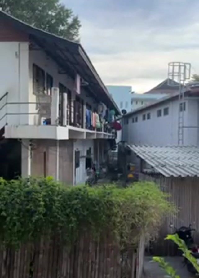 view of a building with laundry hanging on the balcony. The building is white with a dark roof. There is a bamboo fence in the foreground. A second, also white, building is visible to the right. There is a motorcycle parked on the ground in the lower right corner of the frame. The sky is cloudy.