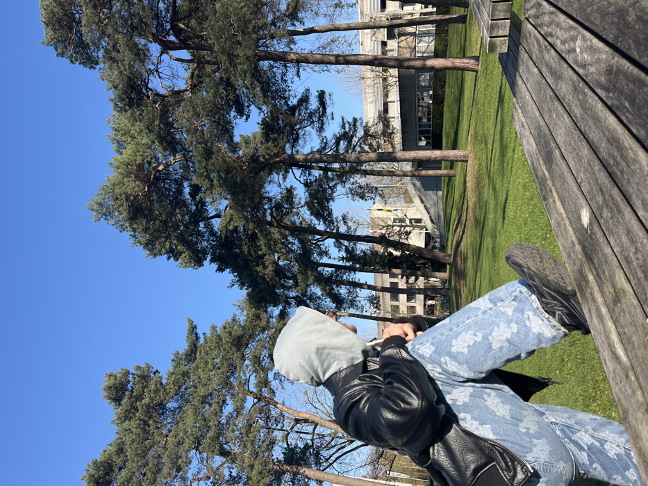 An individual is seated outdoors on a weathered wooden slatted bench, oriented from the upper left to the lower right of the frame. The person wears a light grey hooded sweatshirt with the hood pulled up, a black leather-like jacket, light blue jeans with a repeating white pattern, and black athletic shoes. Their right foot is placed on the bench, and their head is turned to the right, facing away from the camera, looking towards the background. The environment is a green, manicured lawn interspersed with numerous tall coniferous trees. In the midground and background, modern multi-story buildings with light-colored facades are visible. One building features a prominent grey concrete staircase or ramp. Adjacent to this structure, three flags on poles are displayed: a red-white-blue flag (Dutch national flag), a yellow and blue flag (likely the flag of North Brabant), and another flag. The sky is clear and blue, indicating fair weather and sunlight. This scene is identified as being within the Tilburg University campus in Tilburg, Netherlands, based on the specific architectural styles, landscaping, and visible provincial and national flags.
