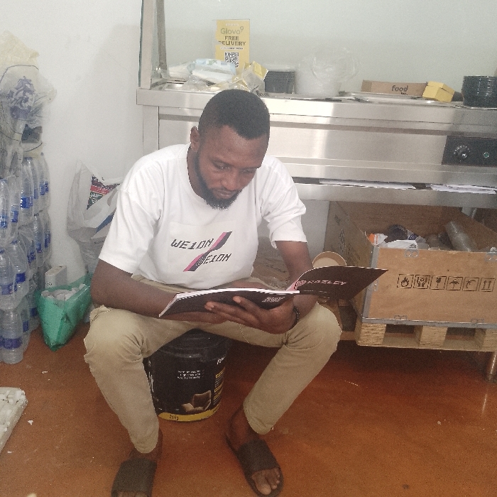 An adult male with dark skin, a short beard, and dark hair is depicted indoors, seated on a black and yellow bucket, which appears to be a 2.5kg supplement tub. He wears a white short-sleeved t-shirt with a "WE1ON WE1ON" logo, light brown trousers, and dark brown slide sandals. His attention is focused downward, reading an open, dark-colored booklet with "NAZLEY" visible on its cover. The immediate environment suggests a commercial kitchen or food preparation/storage area. To the man's left, a stack of clear plastic water bottles, plastic bags, and small white boxes are visible against a white wall. To his right, a stainless steel commercial counter with an integrated sink holds various items including clear plastic containers, plastic bags, yellow-wrapped food items, and black cups. A white sign displaying "GlovO FREE DELIVERY" and a QR code is affixed above the counter. This signage indicates the establishment likely utilizes Glovo delivery services, placing the scene within a commercial context in Abuja, Nigeria. Below the counter, a large cardboard box with international handling symbols (e.g., fragile, this way up) rests on a wooden pallet. The floor is a uniform orange-brown color. No direct interactions between individuals are observed.