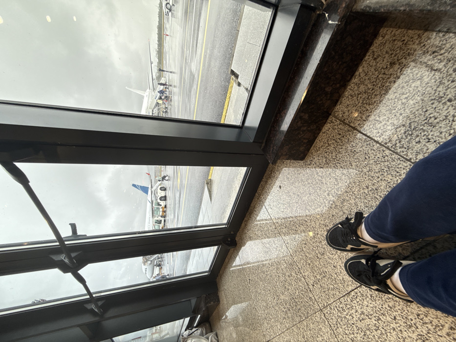 The image depicts a scene from inside the passenger terminal of Batumi International Airport (BUS) in Batumi, Georgia, looking out onto the airport tarmac on an overcast and wet day. In the foreground, the lower legs and feet of an individual are visible. The person is wearing dark blue pants and black sneakers with white soles and tan accents. These rest on a polished, light brown speckled granite or terrazzo floor that reflects light. The view of the exterior is framed by dark-colored, possibly aluminum, multi-pane window structures, which include a horizontal support bar across the upper left section. A dark brown polished granite sill runs along the interior base of the window frames. A light-colored bag is partially visible on the floor to the far left. Beyond the windows, the tarmac is wet, reflecting the cloudy sky. Two white passenger aircraft are visible. The aircraft on the left displays a blue tail with a white marking and has an open passenger door equipped with a mobile airstair. Ground personnel, one in yellow high-visibility attire, are active near this aircraft. A second, partially obscured white aircraft is situated to the right, also connected to a mobile airstair at its rear door. Several individuals, some holding umbrellas, are observed near this second aircraft. The tarmac features yellow markings, and various pieces of airport ground support equipment are distributed across the area. The sky above is uniformly grey and cloudy.