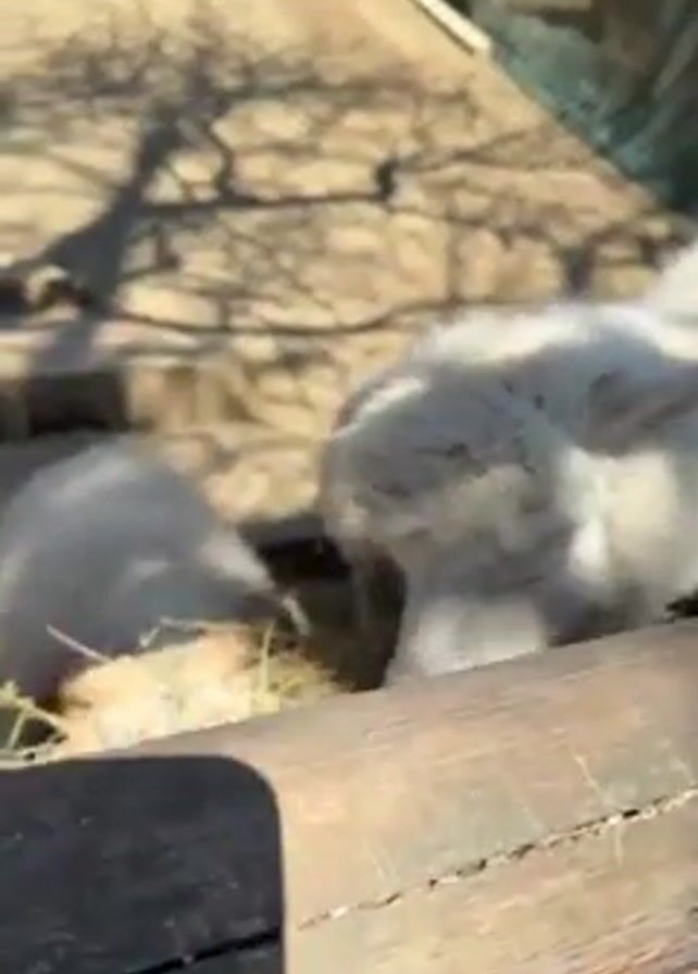 From a position behind a crude, unfinished wooden fence, a medium shot shows four young white llamas eating hay