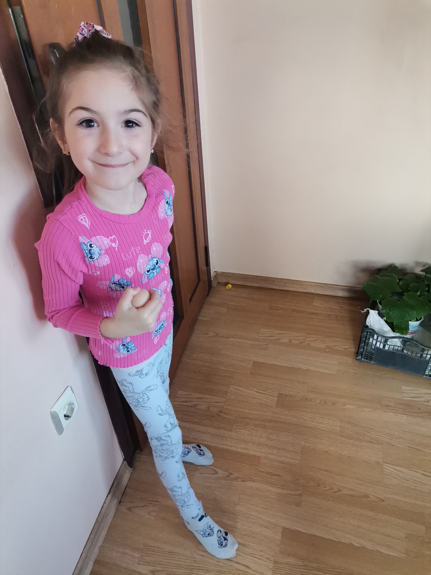 This image depicts the interior of a residential space in Obrochishte, Bulgaria. A young female subject, appearing to be approximately 5-8 years old, stands leaning against a light pinkish-beige wall, positioned near a dark brown wooden doorframe. Her light brown hair is pulled back, secured by a multicolored scrunchie. She has dark eyes and is looking directly at the camera with a slight smile. She is dressed in a long-sleeved, ribbed pink top patterned with blue "Stitch" characters, hearts, and the word "cute." She wears light blue leggings adorned with line drawings of characters and light blue socks with similar character motifs. Small, gold-colored hoop earrings are visible in both ears. Her right hand is partially clenched, holding a light-colored, oval object, consistent with an egg. On the wall to her left, a white electrical outlet is mounted at a lower height. The floor is covered with light brown laminate wood panels. In the lower right corner of the frame, a dark grey plastic crate containing a leafy green plant and a white plastic bag is visible. A small yellow object rests on the floor against the beige wall to the right. The scene is illuminated by ambient indoor light.
