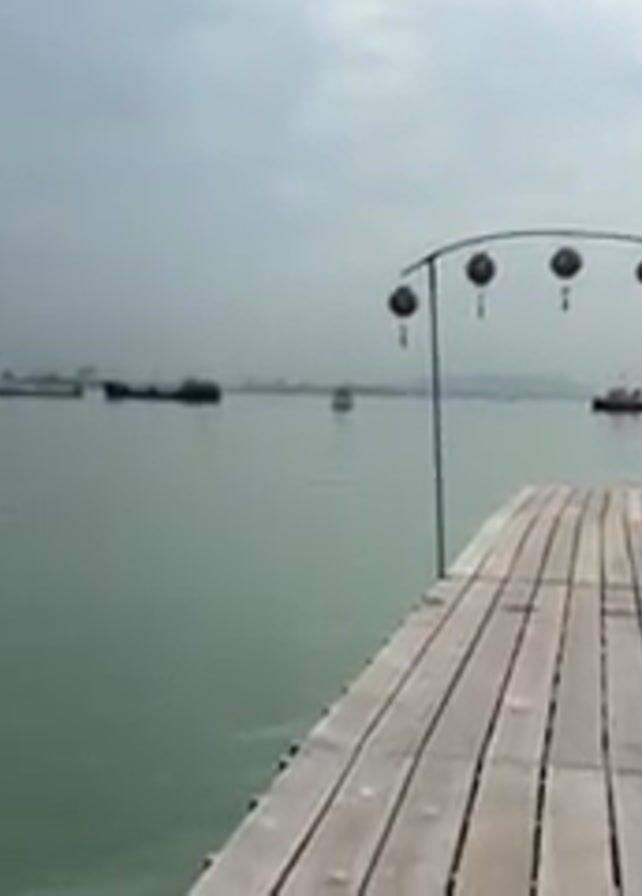 The video presents a scenic view from a wooden pier extending into a body of water. The pier is adorned with a decorative arch featuring hanging Chinese lanterns. The water, a pale green hue, hosts several boats at a distance, with a city skyline visible on the horizon under a cloudy sky. The camera pans slightly to the right, revealing a structure with a traditional Chinese design, likely a temple or shrine, built on stilts over the water, alongside other stilted dwellings. The scene suggests a coastal area in Southeast Asia.