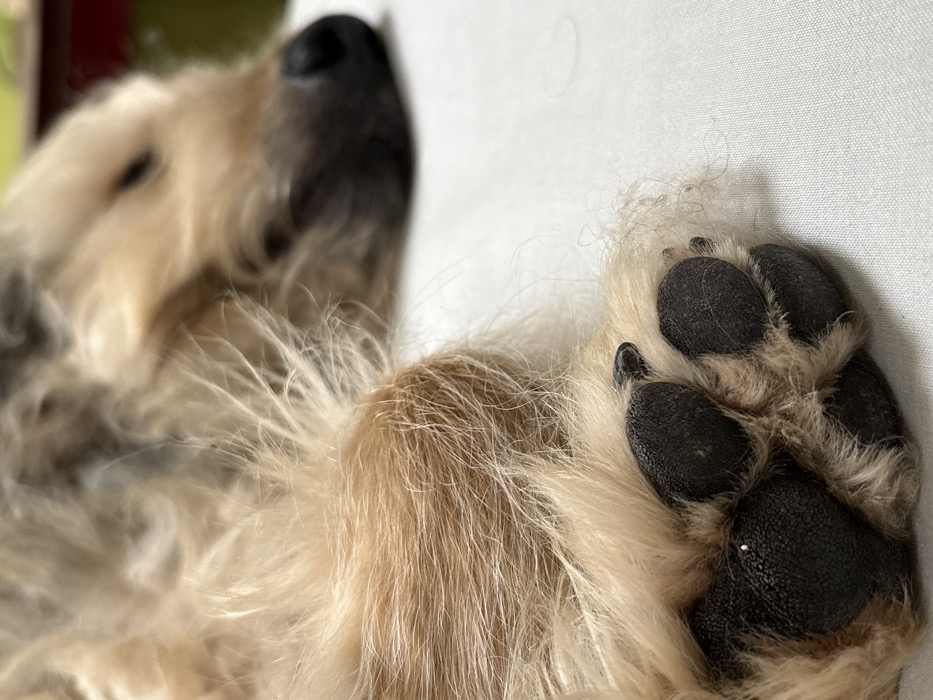 The image depicts a dog resting on a plain white surface. The foreground is dominated by the dog's right front paw, which is in sharp focus. The paw exhibits black, textured pads and is covered in shaggy, light brown fur with some darker strands. A small, white spek is visible on one of the central paw pads. The dog's head and body are visible in the blurred background, indicating a relaxed or sleeping posture. The fur on the head is a blend of light brown and darker tones, and a dark snout is discernible. The overall environment appears to be an indoor setting with soft lighting. No visual indicators are present to establish the specific location within the city of Barcelona, Spain.