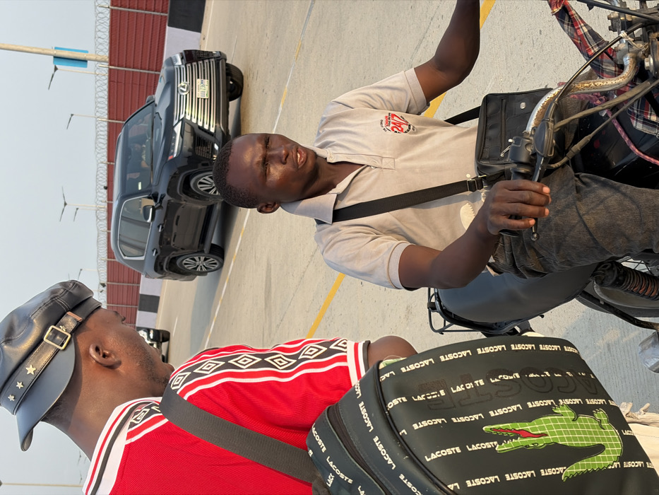 The scene depicts a daylight interaction on a paved road in Alaguntan, Nigeria. Two adult males are visible. The first male, positioned closer to the camera with his back partially turned, wears a black leather cap adorned with gold stars and a buckle. He is dressed in a red short-sleeved polo shirt featuring white trim and a repeating white and black diamond pattern on the sleeves. He carries a black backpack prominently displaying the word "LACOSTE" and a large green crocodile logo. The second male is seated on a black motorcycle, facing towards the first individual. He has a dark complexion and short, dark hair. He wears a light beige short-sleeved polo shirt with a collar, bearing a circular red and black "24/7" logo on the right chest. He also wears dark trousers and has a black shoulder bag with a strap crossing his chest. His hands are on the motorcycle handlebars, and his mouth is slightly open, suggesting he is speaking or listening. The motorcycle has a black seat and a section of plaid fabric near the engine. In the background, a black Lexus LX SUV with Nigerian license plate "AAA 230 HM" is observed in motion on the multi-lane road. The road features yellow painted lines. A concrete barrier runs alongside the road, and beyond it, a red fence topped with barbed wire is visible. Streetlights are present in the distant background against a clear sky. The lighting suggests late afternoon.