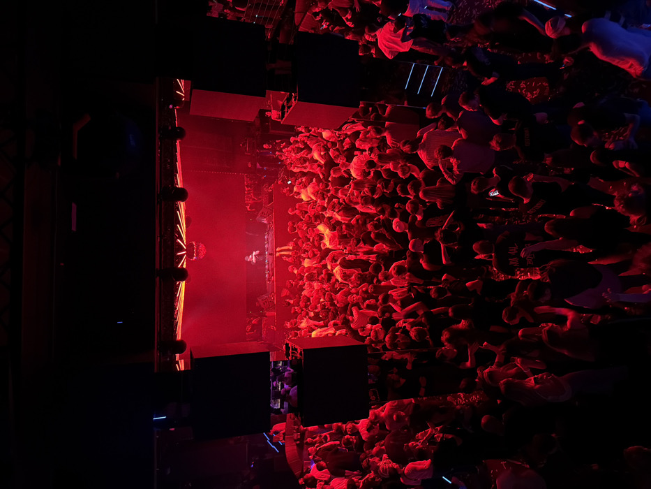 An overhead shot captures a concert's electrifying atmosphere. A brightly illuminated stage stands to the left, bathed in red light. A vast crowd of people fills the space, their faces mostly obscured by the low lighting. The red glow casts a dramatic hue over the audience, highlighting their collective energy. The scene conveys the excitement and intensity of a live performance.