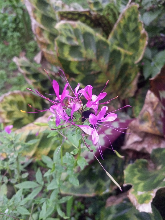 The scene is located in Bamhori, India. The image captures a cluster of vibrant magenta-purple flowers, sharply focused and positioned centrally. Each flower exhibits four petals and multiple slender, extended stamens, some tipped with yellow. A single elongated, light green seed pod hangs downwards from the flower cluster on the right. The flowers are supported by thin green stems bearing small, dark green leaves. The immediate foreground and midground include additional out-of-focus green foliage. The background consists of large-leafed plants with distinct green and yellowish-brown variegated patterns, appearing blurred. Some background leaves exhibit signs of drying or desiccation. The environment is natural and verdant, illuminated by natural light. No individuals, animals, or man-made objects are present within the frame.