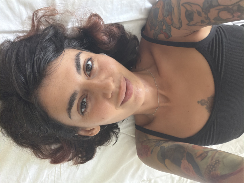 A woman with dark curly hair, tanned skin, and brown eyes is lying on a white sheet. She's wearing a black tank top. She has tattoos on her chest and both arms. Her face is angled towards the camera. She wears a thin silver necklace. The light softly illuminates her face, highlighting her features.