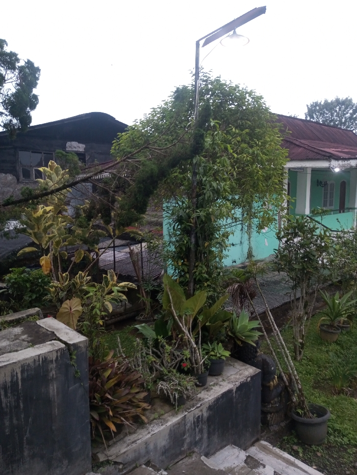 The image displays an outdoor residential garden scene in Ciherang, Indonesia, under overcast weather conditions. In the immediate foreground, dark grey concrete retaining walls with white top edges are visible. The midground is dominated by dense vegetation, including various plants in black pots and planted directly in the soil, featuring large green leaves, variegated yellow-and-green foliage, and several shrubs. A metal pole, integrated into the foliage of a tall tree, stands centrally, supporting a downward-facing street lamp that is illuminated and an angled solar panel atop. Behind the garden, a light blue-green single-story house with a reddish-brown corrugated metal roof is prominent on the right. This house features a white-trimmed porch with an illuminated light fixture and white window frames. To the far left, partially obscured by trees, is a darker, multi-story structure with a dark, sloped roof and exposed window openings. No individuals are present.