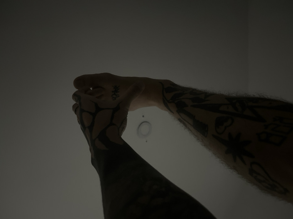 The image displays a low-angle perspective, looking upwards at two human limbs, heavily covered with dark tattoos, positioned against a light grey ceiling. The limbs are angled to form an inverted 'U' or partial 'O' shape. The limb on the left side of the frame is predominantly in shadow, obscuring most tattoo details. The limb on the right is better illuminated, showcasing numerous distinct dark tattoos including a star, a cloud, a lightning bolt, an eye, a heart, abstract shapes, and foliage-like patterns. A human foot is visible at the top-center of the composition, marked with a small, distinct tattoo of symbols or characters on its dorsal surface near the toes. A circular, recessed light fixture, emitting a subtle glow, is visible on the ceiling surface, positioned below the apex of the limbs. The lighting conditions are dim, indicating an indoor environment. This scene is situated in Cordoba, Argentina.