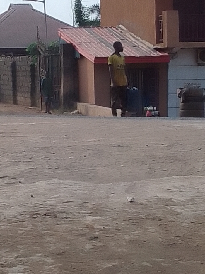 This image, captured in Nkwelle Ezunaka, Nigeria, depicts an outdoor scene dominated by an unpaved, light-colored dirt ground. In the mid-ground, a dark-skinned individual wearing a yellow t-shirt and dark trousers stands facing right, positioned in front of a single-story structure with light brown walls and a prominent reddish, corrugated metal, sloped roof featuring a red fascia. To this individual's left, a dark blue barrel is visible. At the base of the structure's entrance, a red and white container and another small white object are present. To the right of this structure, against a lighter building wall, three black vehicle tires are stacked. Further to the left, a second individual, dressed in dark clothing (shirt and shorts), stands near a dark metal gate and a light-colored block wall, also facing right. Behind this wall and gate, a building with a dark, sloped, corrugated roof is partially visible. A metal utility pole extends from the upper left. Sparse green foliage is visible above the left-hand wall and gate. The background on the right includes a section of a taller, light brown building with a window and an external air conditioning unit. The scene is illuminated by diffuse daylight.