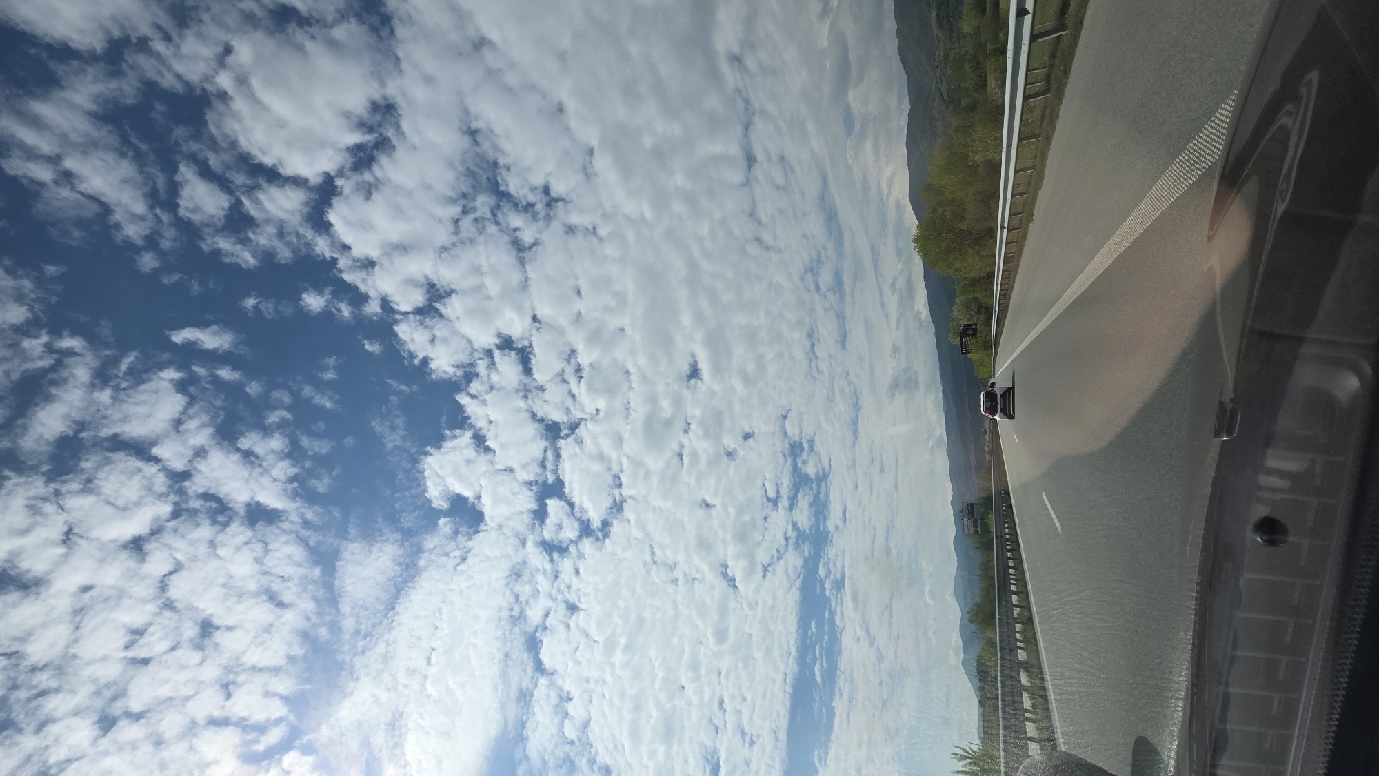 A view from inside a vehicle traveling along a highway near Strumyani, Bulgaria. The highway has a single lane in the direction of travel visible in the image, with a painted white line marking the lane's edge. The side of the road is lined with a metal guardrail. In the distance, there are mountains and trees. The sky is blue with patchy clouds. The vehicle's dashboard is visible in the foreground. Another vehicle is visible on the highway in the distance.