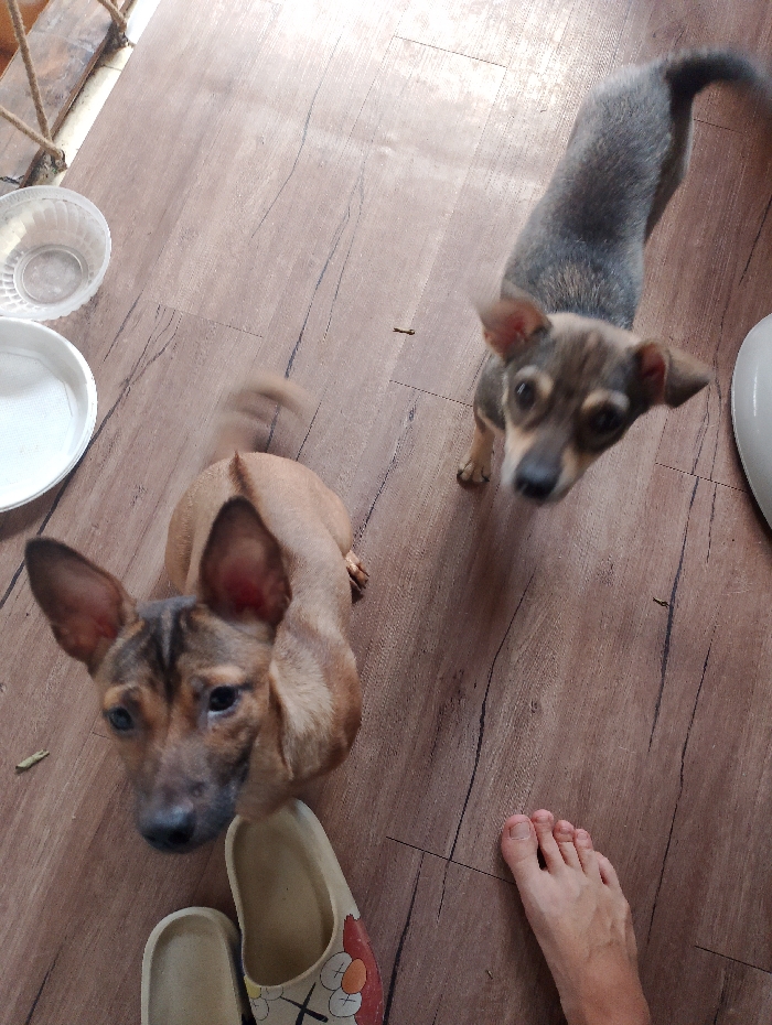 An indoor scene features two small dogs on a light brown wood-grain laminate floor. In the foreground, a tan dog with darker facial and ear markings looks upwards. Its tail is blurred from motion. Adjacent to this dog are a pair of light-colored slip-on slippers; one displays a red accent and a stylized white cartoon character design. In the background, to the right, a smaller, grayish-brown dog stands, also looking upwards with a motion-blurred tail. A bare right human foot is visible in the lower right quadrant. In the upper left, two empty pet bowls, one clear plastic and one opaque white, rest on the floor. A partial view of an outdoor area with a wooden railing is visible through an opening in the upper left background. The specific location within Nha Trang, Vietnam, cannot be determined from the image.