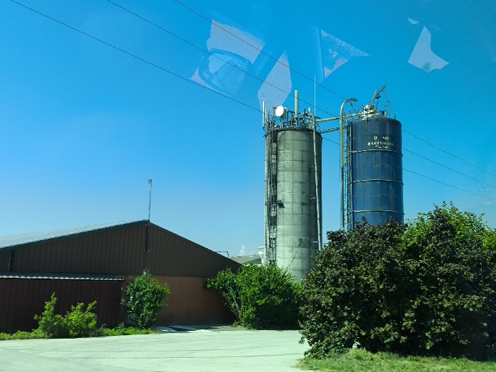 Two industrial silos stand tall against a clear blue sky. The silo on the left is light gray and equipped with antennas and a ladder. The right silo is dark blue, labeled with white text, and connected to the other by a pipe. In the foreground, a low-slung brown building sits adjacent to green shrubbery. Overhead, power lines stretch across the scene. Reflections are visible in the glass through which the photograph was taken.